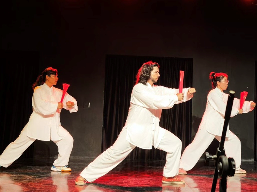 演出在观众热情的氛围中展开,涵盖音乐、舞蹈、歌唱与武术等多种形式。太极扇与太极剑表演刚柔并济,由学员徐敖(João Francisco Figueiredo Miranda)与孔院教师共同呈现,展现了中国武术的深厚内涵。